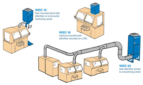 WSO主要優(yōu)點有:1. WSO油霧過濾器可以滿足各種設(shè)備的安裝要求:可安裝在機頂、地面或連接中央管道系統(tǒng),如下圖: